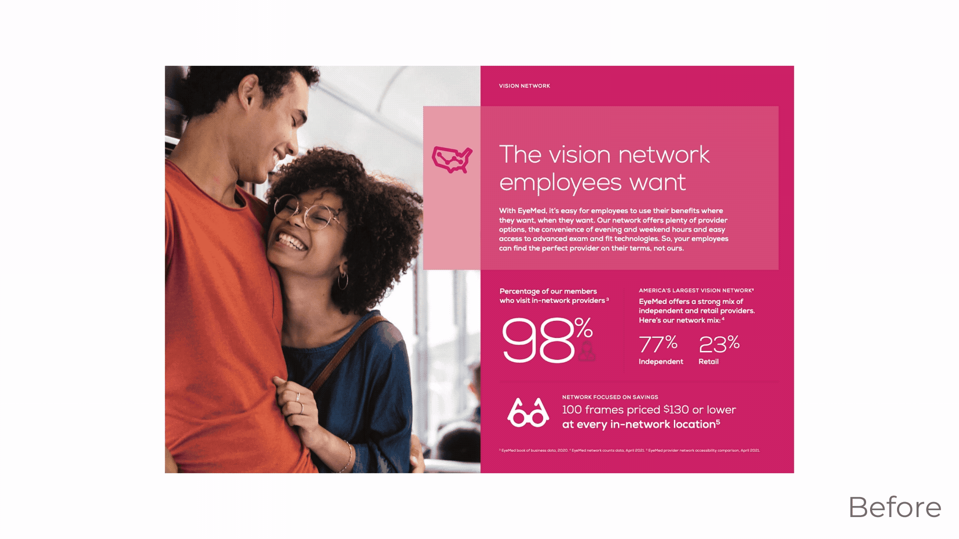 EyeMed asked us to update their brand to reflect the classic elegance of their parent company, EssilorLuxottica. Our refreshed brand elements were built in close collaboration with EyeMed to ensure they remained clear and flexible for a variety of use cases. We also built new brand guidelines to showcase how they’re designed to work together as a system and allow team members to combine elements for any piece of collateral. The result was a modern and functional evolution of the brand, seamlessly connected to EssilorLuxottica while staying true to EyeMed’s personality.